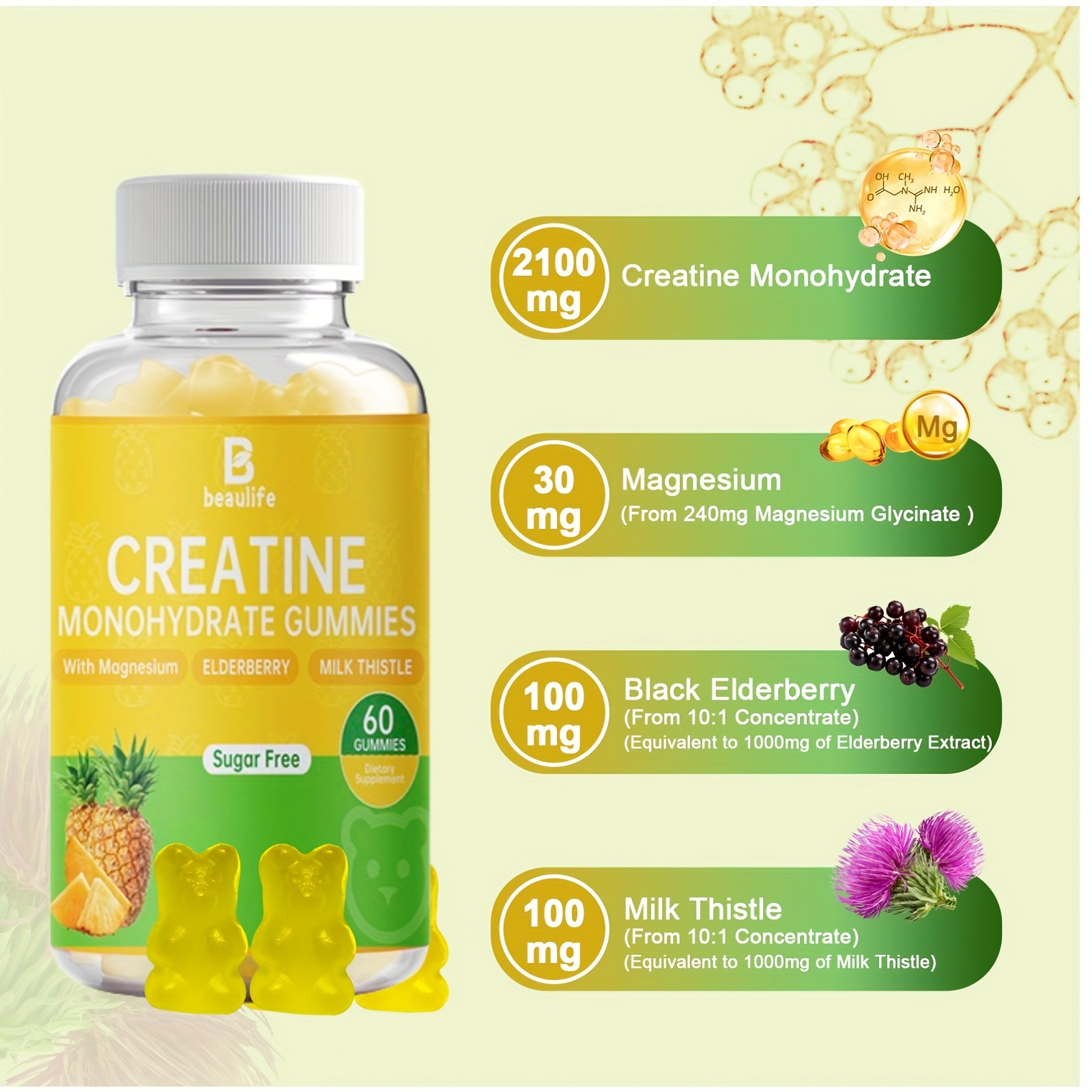 1btl, Creatine Monohydrate, 60pcs Gummies, Sugar-Free, Supplement, Magnesium, Black Elderberry, Milk Thistle, Creatine, Little Bear Shaped