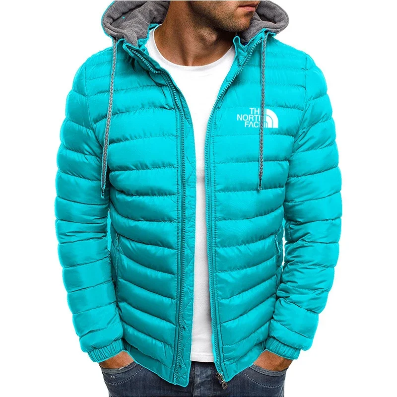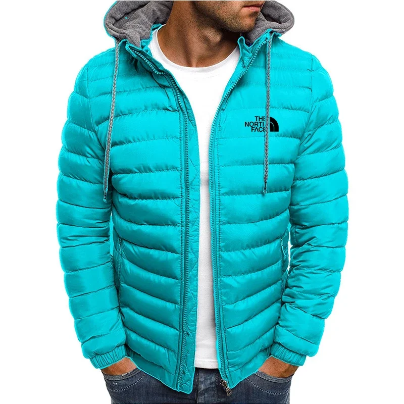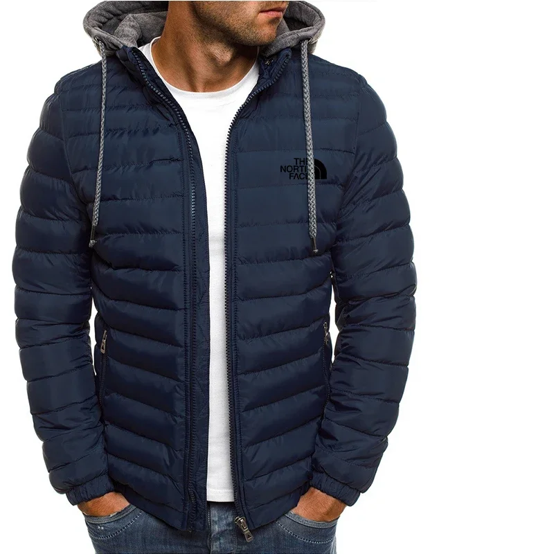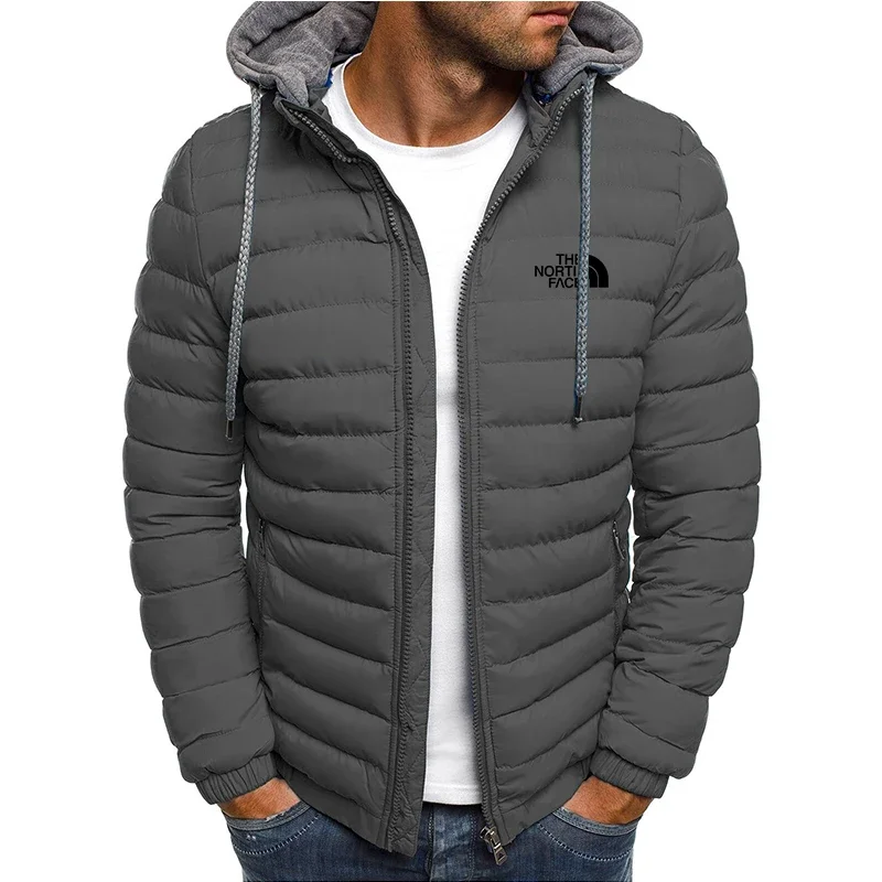 New men's short hooded cotton jacket for autumn and winter, outdoor windproof, warm and casual zipper printed men's jacket